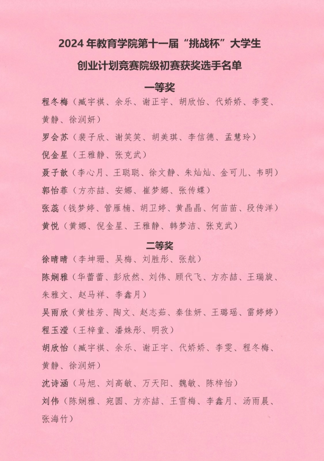 2024年必赢国际437官网第十一届“挑战杯”大学生创业计划竞赛院级初赛获奖选手名单