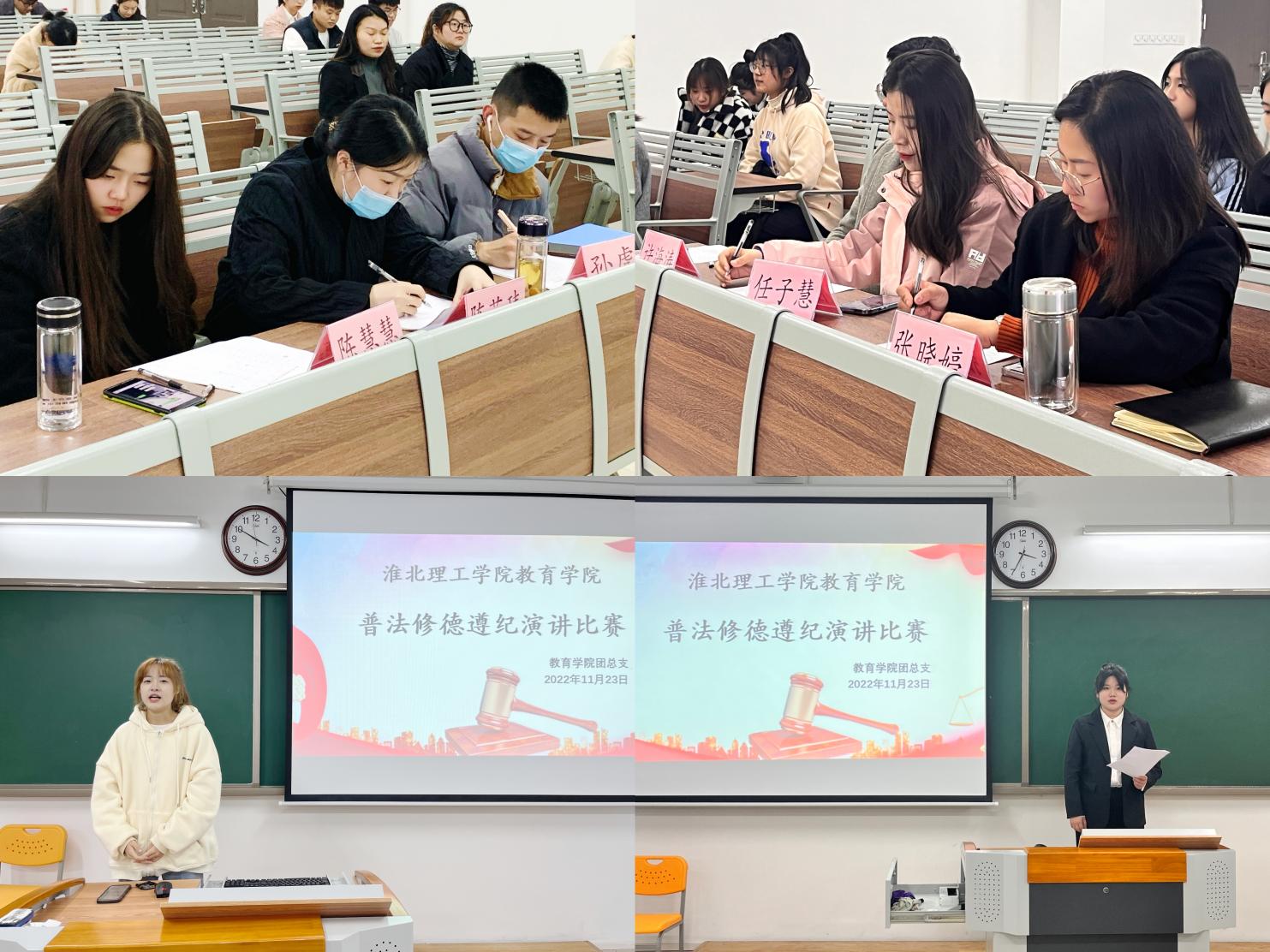 为加深同学们对于普法活动的深刻理解,创新宣传教育方式,必赢国际437官网在2号教学楼开展了以“普法、修德、遵纪、创建文明校园”为主题的演讲比赛。由各班级推选一名同学参加院级比赛。同学们积极参与,结合自身经历与时代精神,抒发心中之热血,从不同角度用铿锵的语言表达自己独到的思想。昂扬向上的《践行守法使命,谱写青春华章》,宏观大气的《青年共学法,法治强中华》,微观细腻的《做遵纪守法的好青年》,“走新”又“走心”。同学们纷纷表示通过本次活动加深了自己对宪法的理解,感受到学习宪法所带来的爱国情怀和民族自豪感,并承诺一定会成为法律的严格遵守者和坚定捍卫者。经评选,朱灿灿、黄丹妮等5人获得一等奖,张昊天、谢文蓉等10人获得二等奖,王茹、杨梦雅等15人获得三等奖。相信所有同学也将会立足当下,面向社会,让社会主义法治精神深入人心!