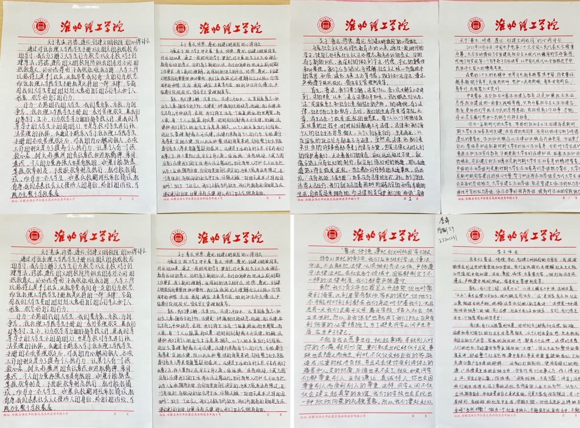 为树立当代大学生知礼守法,讲文明树新风的青春风貌,10月下旬,必赢国际437官网要求全体学生认真手写一份不少于1000字的心得体会,并就主题做出承诺书。同学们用肃穆的文字,庄重的承诺,表示定会将法治精神落实到日常事务之中,活动成效显著。