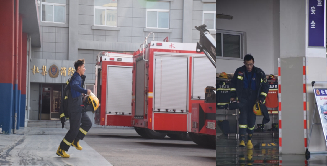 寻访中,突然一声警铃响起,消防员们立刻放下手中所有事务,以最快的速度奔向消防车库,穿上厚重的消防服,直接跑向消防车。眼前的场景带给同学们极大震撼,对消防员更加肃然起敬。