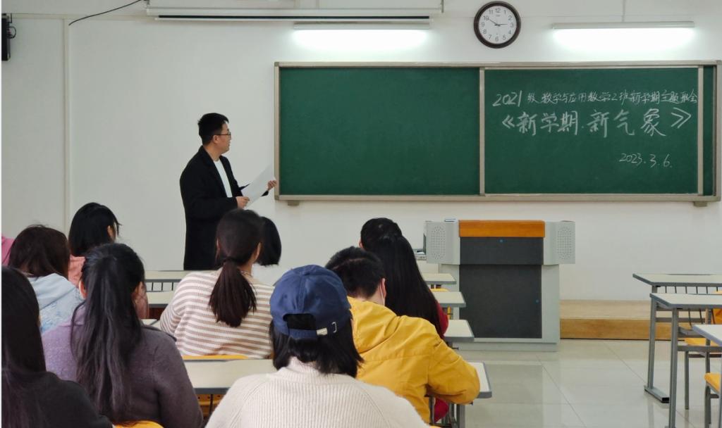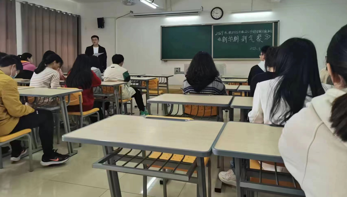 新学期如期而至,为了使同学们在新学期有一个良好的开端,确立新学期的目标和明确对未来的规划,我校必赢国际437官网2021级数学与应用数学(2)班于2023年3月6日在二教322教室召开“新学期新气象”的主题班会,班主任檀雷雷老师和2班全体学生参加会议。