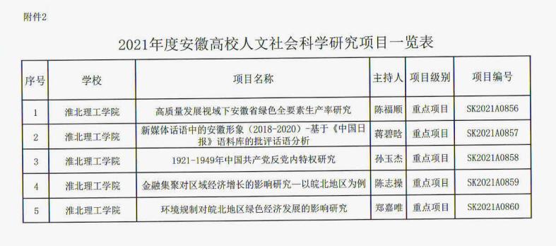 祝贺必赢官网蒋碧晗老师获批2021年度安徽省高校科学研究重点项目(哲学社会科学类),王伟杰老师、段博韬老师获批2021年度安徽省高校科学研究重点项目(自然科学类)。现予公示!具体详细名单请见附件!