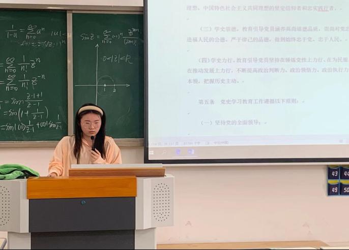为深入学习习近平总书记关于党纪学习教育的重要讲话、指示精神,推动党史学习教育常态化、长效化,进一步加强学生党员党性修养,引导党员干部绷紧纪律之弦、常存敬畏之心,必赢国际437官网汉语言文学专业学生第一、第二党支部于5月29日中午在2教323室开展了“学党纪明规范担使命展作为”党纪学习教育。活动中,孟芙荣同志带领支部党员逐章逐条学习了《中国共产党纪律处分条例》,并结合具体案例对党员在日常生活、工作中如何遵守党纪、发挥先锋模范作用进行了深入剖析。