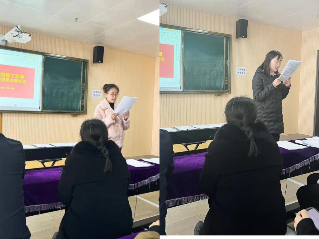 大会第一项议程:讨论接收蒋碧晗、王伟杰同志为预备党员。大会严格按照党员发展程序:首先发展对象分别汇报了自己对党的认识、入党动机、现实表现、入党决心。随后,由入党培养人向大会介绍培养、考察情况及个人对被培养人入党的态度,支部报告了审查情况。接着,与会的党员同志对蒋碧晗、王伟杰同志的入党问题进行讨论、发表意见。最后,有表决权的党员以无记名投票方式进行表决,由监票人宣读了票决情况。根据党内有关规定和票数统计结果,大会同意接收蒋碧晗、王伟杰同志为中国共产党预备党员,预备期一年,决议将报上级党委。