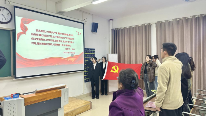 活动最后,全体党员同志面对鲜红的党旗,举起右手重温入党誓词。庄严宣誓,这是青年学子对党的承诺,更是对自身的激励:无论遇到什么困难和挑战,都将坚定信念、勇往直前、不懈奋斗!