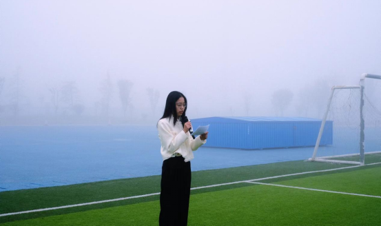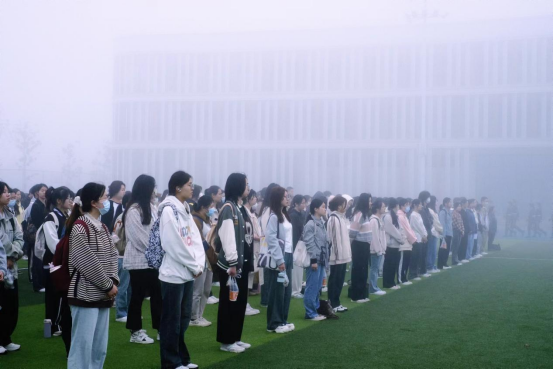 升旗仪式正式开始,国旗护卫队迈着铿锵有力的步伐庄严入场,五星红旗在晨曦中冉冉升起;全体师生整齐肃立,目光如炬,高唱国歌,向祖国表达崇高敬意。