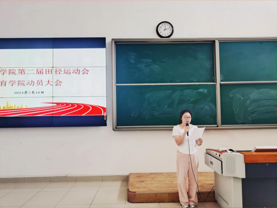 首先向参加这次运动会的同学们表示祝贺,参加会议的运动员都是各班积极报名的同学中严格选拔出来的。同时她也向在这次运动员选拔工作中付出辛勤劳动的专业指导老师、辅导员表示感谢。