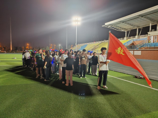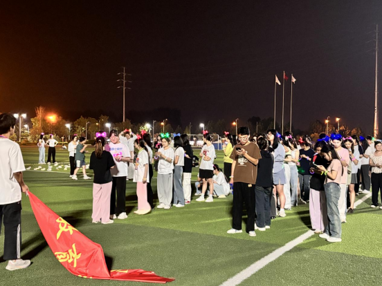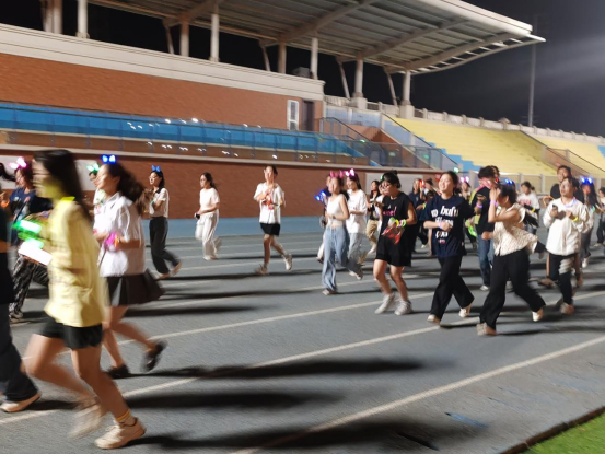 活动开始前,同学们在操场主席台前集合,在工作人员的引导下,有序排队签到,领取号码牌和荧光棒等物资。同学们仔细听工作人员讲解的活动规则及注意事项,并在领队的带领下做了热身运动,随后打开运动软件,等待夜跑开始。随着一声号令,同学们化身为光,点亮校园的操场。