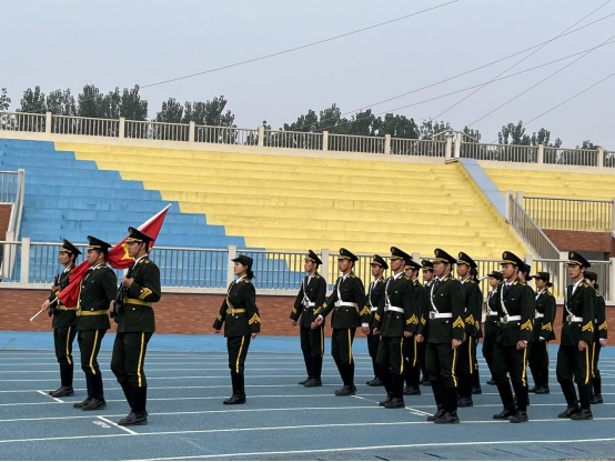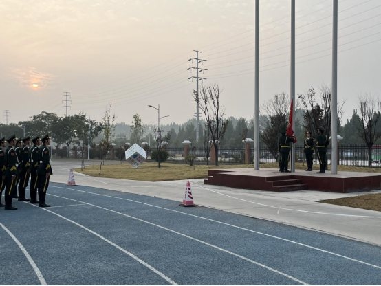 随着激昂的音乐响起,英姿飒爽的国旗护卫队迈着整齐有力的步伐,护送着鲜艳的五星红旗走向升旗台。庄严的国歌声中,五星红旗冉冉升起,师生们肃立注目,心中满是对祖国的崇敬与热爱。